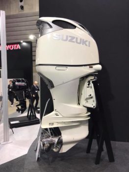 元気といえば、このギョウカイはホンダよりスズキの方が明るい。下の船外機は350馬力! 4400ccのV6を天地方向に搭載し、2重反転ペラを回す。このタイプの船外機はフロリダなどに人気。完全に遊ぶフネ用で、こんな船外機を3機掛けとかで使う(1機369万円)。走り出したら全開また全開のため3~4年毎に交換だ。スズキはイケイケぶりが評価され、人気上昇中なのだった。