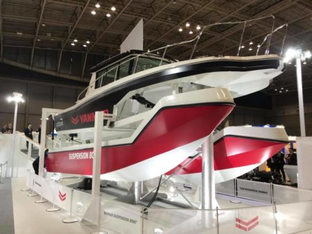 はたまたヤンマーはサスペンション付きボートのコンセプトモデルを出してきた。これまた日本のボートギョウカイじゃ異例! こういった意欲的な技術をプレジャーボート分野に出してきたことなど皆無ですから。分離構造のフロートを2つ油圧でコントロールし、クルマのサスペンションのように動かす。どんな乗り心地なのか興味津々。世界的な話題になると思う。