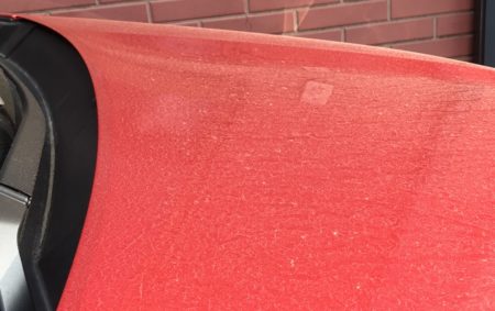 ということで本日、Aピラーから前だけ軽く水洗い。花粉付いたままだと塗装を傷める。もちろん手洗いですよ! するとどうよ! 当たり前のことのようにピッカピカ。本当に2年間、大気汚染物質多い東京の、さらに鉄粉飛び散るバス通り沿いの屋根無し駐車スペースに駐めているクルマである。新車の塗装よりコンディション良く、水垢など全く付かない。