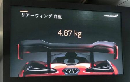驚くのが軽量化。フロントフェンダー、1枚660gしかないそうな。カーボン製リアウイングも4.87kg。そのウイングが最大500kgのダウンフォースを作り出すそうな。このウイングの上に私が6人乗っても壊れないということ。「どれどれ?」とウイングを揺さぶってみたら、地面から生えているようにガッシリしてる! しかもこのウイング、ブレーキで瞬時におっ立つ!