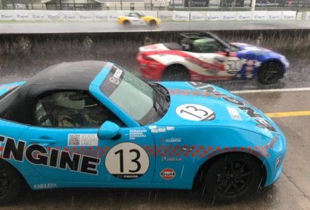 村上編集長が担当するスタートから30分くらいして大雨! 直後に最終コーナーからタコ踊りし、ストレートでコースアウト&クラッシュしたクルマが出たため赤旗中断! もはやコースの至る所に水たまり出来ちゃってます。初レースのビギナーも出場しているため、中断は正しい判断だと思う。そうこうしているウチ、雨も上がり3時間レースとして仕切り直しになった。