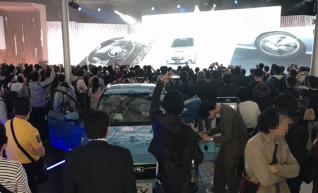 興味深かったのが新型ヤリスと新型レヴォーグ。ヤリスはモーターショー会場の隣に(ヴィーナスフォート2階)置いてあるせいか、16時くらいに立ち寄ったら本日もガ~ラガラ。一方、会場の中のお立ち台に展示されてるレヴォーグは朝から夜まで下のような大賑わいだ。人間、スイッチ入ったら凄いけれど、入らないと無関心。今までのモーターショーじゃ絶対見られなかった光景です。