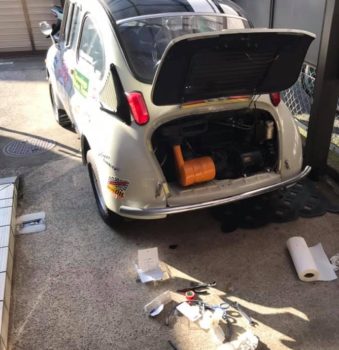 11月3日に桐生で行われるイベントに展示しようとしているスバル360は苦戦中です。このクルマ、三重県で買って帰る途中にエンスト。燃料タンク容量が3分の1くらいになると燃料来なくなる持病を持っていた。バイクと同じく落下式のタンクなので、ある程度燃料入ってないと落ちてこないようなのだ。その後もアメリカで再発し、突発性エンコは最大の弱点になっていた次第。