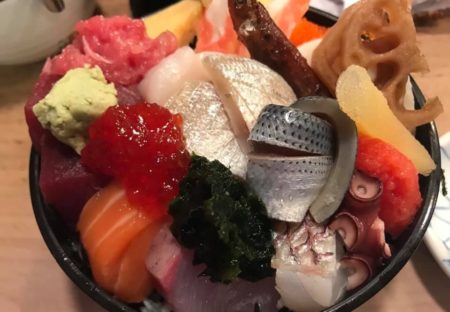 私が海鮮丼(東京だとちらし寿司)ヒョウロンカになったのは、こいつを食べてからであります。とにかく素敵過ぎる! 写真を見て頂ければ解る通り、いろんなネタが載っており見て楽しい! サーモンから時計回りに、筋子、赤身、タチウオ、貝柱、剥き身、玉、カニ、ワカサギ、カマボコ、レンコン、数の子、タラコ、タコ、コハダ、タイ、ノリ、ブリというラインナップ。