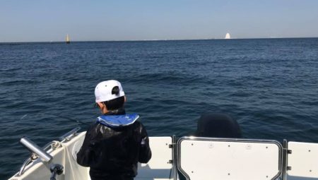 本日ギョウカイのバーベキュー大会のおかづをゲットすべく、6時に出港。狙いは天ぷら用のキスです。出港時は珍しいくらいのべた凪だったのに、2時間もしたら南からの爆風。海ほたるの風速みたら10m! そら荒れるハズです。小学校6年生の釣り師見習いには厳し過ぎるコンディション。しかも今年はキスの具合があまりよくないらしい。