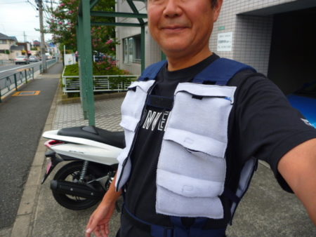 例えばカキンカキンに冷えた冷却剤をベストのポケットに前面6個。背面6個。背中の首筋に1個の計13個セット。着た感じは上のようになります。バイクに乗らないときはこれだけでOK。冷え冷えでございまする。こいつの上からライダージャケットを着る。クールベスト無しで気温35度の炎天下を走るとクラクラするけど、快適であります! 信号待ちの時に暑くないから嬉しい。