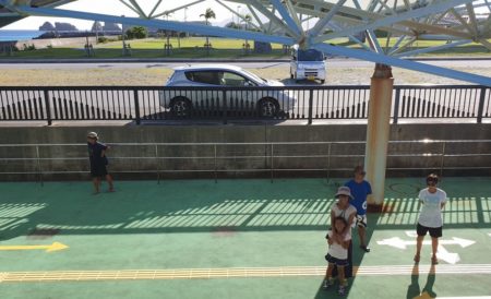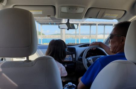 リーフは子供達にも人気らしい。やはり静かだし乗り心地良いし、何よりガソリンやオイルの臭いがしないため気持ち悪くならないんだと思う。クルマ酔いする子供はシートロエンを掛けてリーフに乗れば99%気持ち悪くならないだろう。また、沖縄まで帰るフェリーや高速船の待ち時間の島内ドライブも人気とのこと。美しい海と空に電気自動車がよ~く似合います。