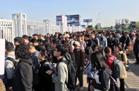 北京に着いてからず~っと空が青い。昨年まで健康被害まで出ていたことを考えれば驚くべきことである。市内7時発のバスで会場に到着すると、やはり押すな押すなの状況。とうていプレスディと思えない混雑ぶり。ダフ屋もおり、プレスディからお金払えば入れます。プレスパスを受け取る窓口で15分くらい並んだものの、無事会場へ。