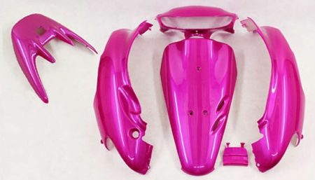 ヤフオクで探すもなっかなか出てきません。半分諦めていたら、互換品を発見しました! 外装6点セットで4300円! ちょっと色が違うけど壊れているカウルよりいいっしょ! 正確に言えば前期型用で、私のモデルと右カウル形状だけ少し違う(マフラー変わっているためです)。後期型用もあったけれど、ヘンな色しか無く断念。フロントカウルだけ変えてもいっか、と。