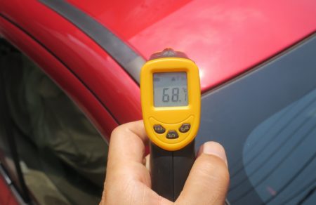 練馬区のアメダスが36.3度の時間帯にクルマのいろんな場所の温度を測ってみました。一番暑かったのは当然の如く直射日光当たるボンネットやルーフ。何と68度! こらもうタマゴのタンパク質が固まる温度。ここに20分くらい放置しておくと、生ゆでくらいの状態になります。もちろん手で触ったら「あっちっちぃ~っ!」。ただ塗装はタフなので、鶏の糞や樹液無ければ問題無し。