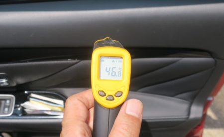 室内はどうなっているかと直射日光当たってるダッシュボードやドア上側の黒い樹脂の温度を測ってみると、あらまの46度! なぜか? アウトランダーPHEVのフロントガラスって熱線吸収ガラスを使っているためである。意外にも車内の様々な部分を計測してみたが、フロントガラスごしに太陽光当たってる場所が案外低い。室内全てで50度を超えるような場所はなかった。