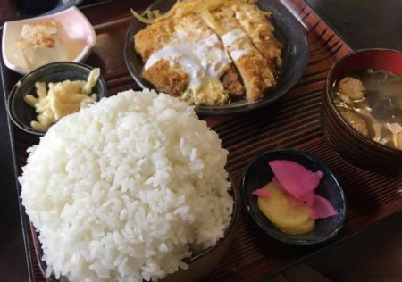 当然ながら「大盛り」というのもある。下の写真です。同業者の中込さんがオーダーした。入れ物見えないけれど、例のお櫃。そいつにテンコ盛りだ。現物を見ると「う~ん!」とウナる。下を見て1kgくらいあるだろう。御飯だけで1700kカロリーですぞ! これに600kカロリーのカツ頭を付ければ2300kカロリー。こんなん喰ってれば太るっしょ!