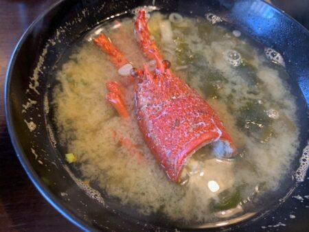 全体に衣が厚めで、東京の高級天ぷら店のような上品な仕上げではありませんが、いかにも漁師料理のような雰囲気があって良かったです。伊勢海老の頭の部分を使って出汁をとった味噌汁も、出汁が良く効いていてなかなか良い具合でした。