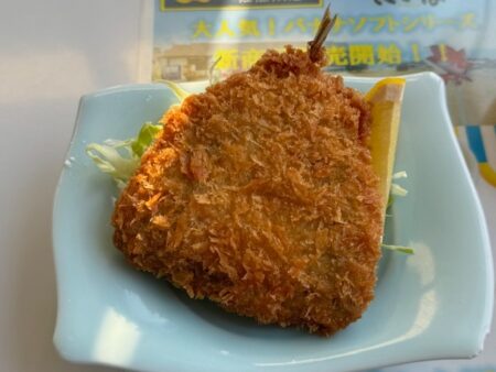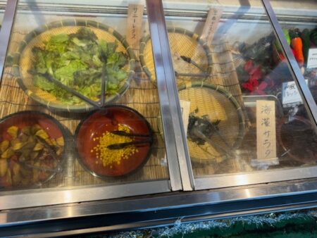 この店では、定食や丼などを注文すると、自動的にサラダや地魚天麩羅、惣菜などのバイキングが付くという設定になっていました。サラダと漬け物などを取って食べていると、単品で追加注文した鰺フライが最初に出てきました。内房と外房の境目の立地なので、内房で有名な黄金鰺かどうか分かりませんが、房総に来たら鰺だろうと思って追加しました。国産の鰺なので大きさはさほどでもありませんが、肉厚でふっくらした鰺フライをおいしくいたただきました。