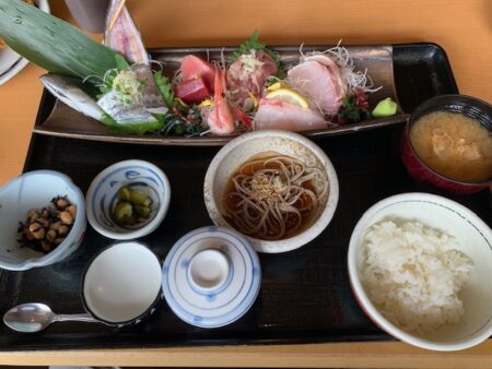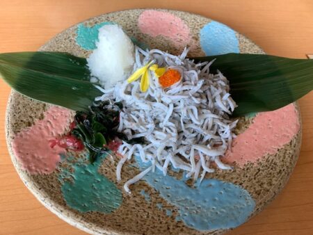 しらす丼やこの店の看板メニューである快飛丼などもありましたが、がっつり食べたいと思い、お刺身御膳(1958円)に釜揚げしらすおろし(638円)としらすのクリームコロッケ(528円)を追加しました。鰺の刺身と敲きを中心に、まぐろや地魚などが盛られた刺身御膳は新鮮でまずまずのおいしさです。味噌汁、小鉢、茶碗蒸しなども良い具合でした。釜揚げしらすおろしは十分なボリュームがありました。