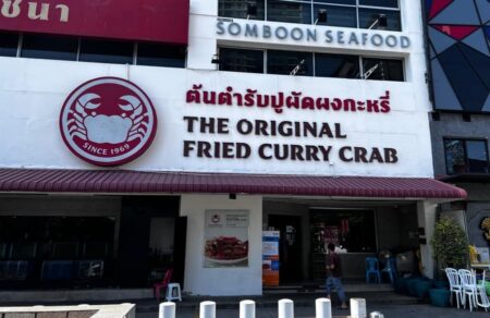 ちなみに、タイ語の料理名を日本語で分解すると、プー=蟹・パッ=炒める・ポン=粉・カリー=カレーということだが、珍しく辛くないから日本人向き。食感は、トロトロの蟹味スクランブルエッグという感じで、とにかく旨いのでヤミつきになる。何度か日本でも食べたが、ソンブーンの味にはホド遠く、やはりプーパッポンカリーはソンブーンでなきゃ、ということになる。もっともバンコクの他のレストランで食べ比べたことがないのは残念だが。
