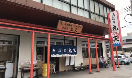 市内から10分ほどで到着。なるほどけっこうな店の数だ。こうなるとドコで食べたらいいか迷う。ということでグーグル先生に聞いてみたら、多くのサイトで『丸天』と『かもめ丸』を上位に上げている。最近食べ物はハズレが多いため、皆さんの意見を参考にしてみることにします。ということで探すと、両方すぐ見つかった。昼前のため、どちらも空いてます。