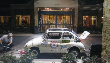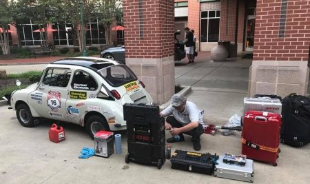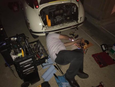 フロリダを出発してからの5日間、毎日”町のヒストリックカショー”が19時30分に終わってから23時までフルメンテを行ってます。喜多見さんが走行チェックを行った上、ジャッキアップしてサスペンション関係など足回りのボルトの増し締め、ガタのチェック、そしてブレーキのコンディションも。