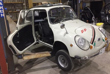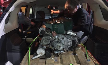 スペアエンジンは本体の他、ミッションやダイナモ、セルモーターなど全てセットされた状態。ヴィンテージ宮田の工場長が整備してくれました。どの部品壊れても交換可能であります。車両は送り出しに向けた準備中。バルクヘッドをチェックするも走行中に排気ガス臭くなる原因が未だに掴めません。