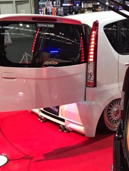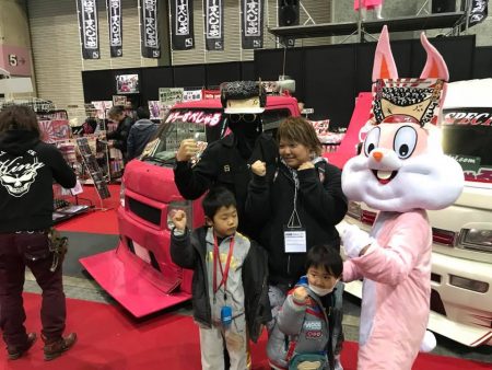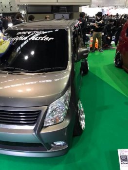 下はスズキのワークスカー。タイヤ見たら最近爆発的な人気のトーヨー・オープンカントリー。このカッコ良いタイヤです。ダイハツのブースに行くと、やはり商用車ベースの軽自動車+オープンカントリー。自動車メーカーも意識してる。