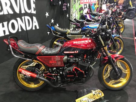 バイクは当初「懐かしい」と思ったが、近寄って感心しきり。塗装の品質、素晴らしい。この手のバイク、40年前は裏庭でスプレー缶振って塗った仕様。一方このバイクの塗装ときたら、奥行きあって職人の仕事である。飾り物になるほど。