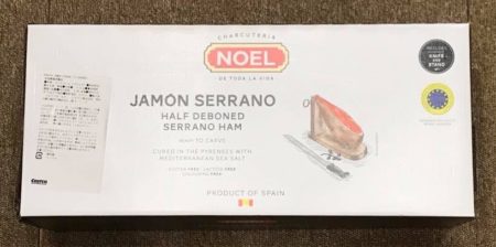 必要な生活物資をコストコまで買いに行ったら、なんと! ハモンセラーノをブロックで売ってる! コストコで初めて見ました~。骨なしの2kgだから食べられそうな雰囲気。残り3つ。ハモンセラーノ好きとしちゃ買わないというチョイスなど無し! あっさり釣られる! しばらくハモンセラーノ食べ放題だ! 箱の中にはブロックの他、切りながら食べられる”台”や包丁も入ってる。