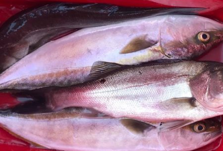 ということをやっていたら5時間分しか仕事終わらず、半分残して翌日回し。翌日は「そんじゃ釣りだ!」とばかり出漁したら、マリーナから10分の荒川河口で鳥山に遭遇! ルアー投げたらポンポンとフッコ-イナダーフッコ-イナダと連続4本! しかぁし! イナダ上げルアーをはずそうと思ったら暴れられ、親指に激痛! グッサリとフックが貫通してる! こんなに深い貫通は初めて。