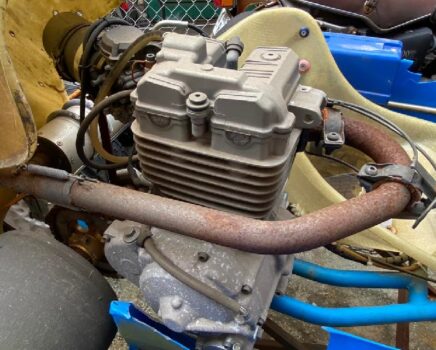 Super Winforce-Kのシャシは使いモノにならないと思うけれど、エンジンはイケる感じ。20時間くらいしか走っていないです。前輪にブレーキが付いてないカートにこのエンジン積むと、ホントに手強いです! 当時の2スト100ccのレーシングカートと違う迫力ありました。乗ろう乗ろうと思っているウチ、こんな状態になってしまった~。当時、忙しかったんだと思う。