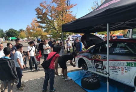 デビューから3年経ったMIRAIながら、意外なことにけっこう人気あります。やはり絶対数が少ないため、水素ステーションの多い大都市を除けば珍しいんだと思う。しかも車高落としてステッカー貼ってリアウイング付けたらカッコ良い! しかもラリー車としちゃトンデモナク大きいため目立つ。サービスにもたくさん人が来てくれます。ラリーの奥行きを見て貰えて嬉しい。