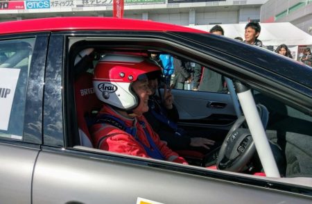 ミニラリーの後、同乗走行。1時間で20人! というフルハーネス付きのクルマとしちゃ記録的な人数をこなせるかと心配したが、開発チーム有志は新城と神戸で「体験乗車」(座ってフルハーネスする)をやったためか驚くほど素早い! 見事20人完乗させましたね~! 降りる時の皆さんの笑顔がステキでした。