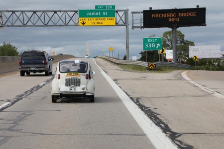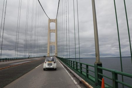 国沢さん曰く「本来の力を取り戻した」というスバル360は、五大湖にかかる橋、マキナックブリッジを渡る。全長5マイルというこの橋、左にミシガン湖、右にヒューロン湖という眺めは、もはや湖というスケールではない。湖で水平線を見ることになるとも思わなかった。アメリカの大きさを思い知ったのは、ここだったかもしれない。